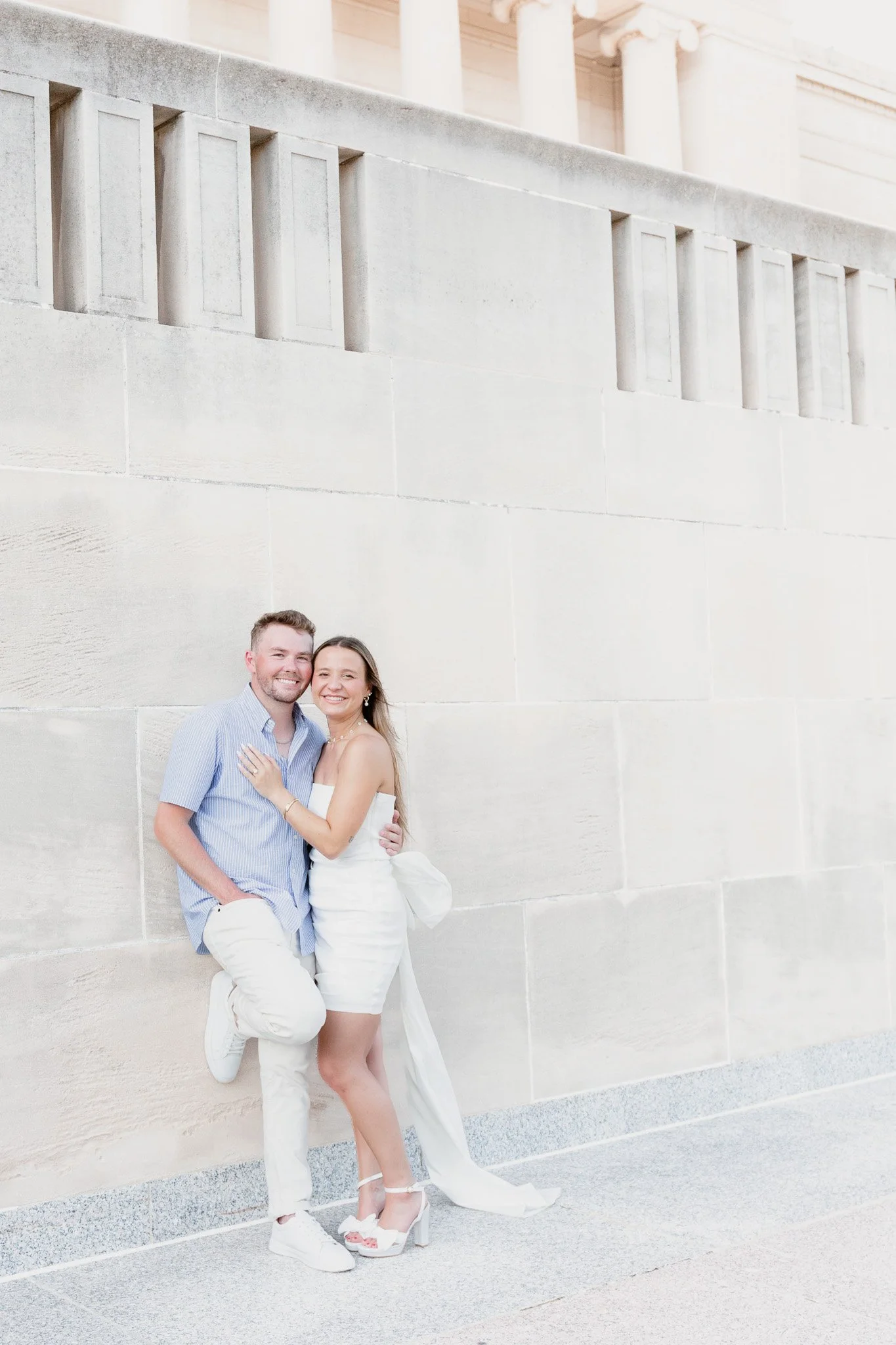A happy couple in white and blue outfits standing close together against a beige stone wall, smiling at the camera at The Nelson-Atkins Museum of Art.